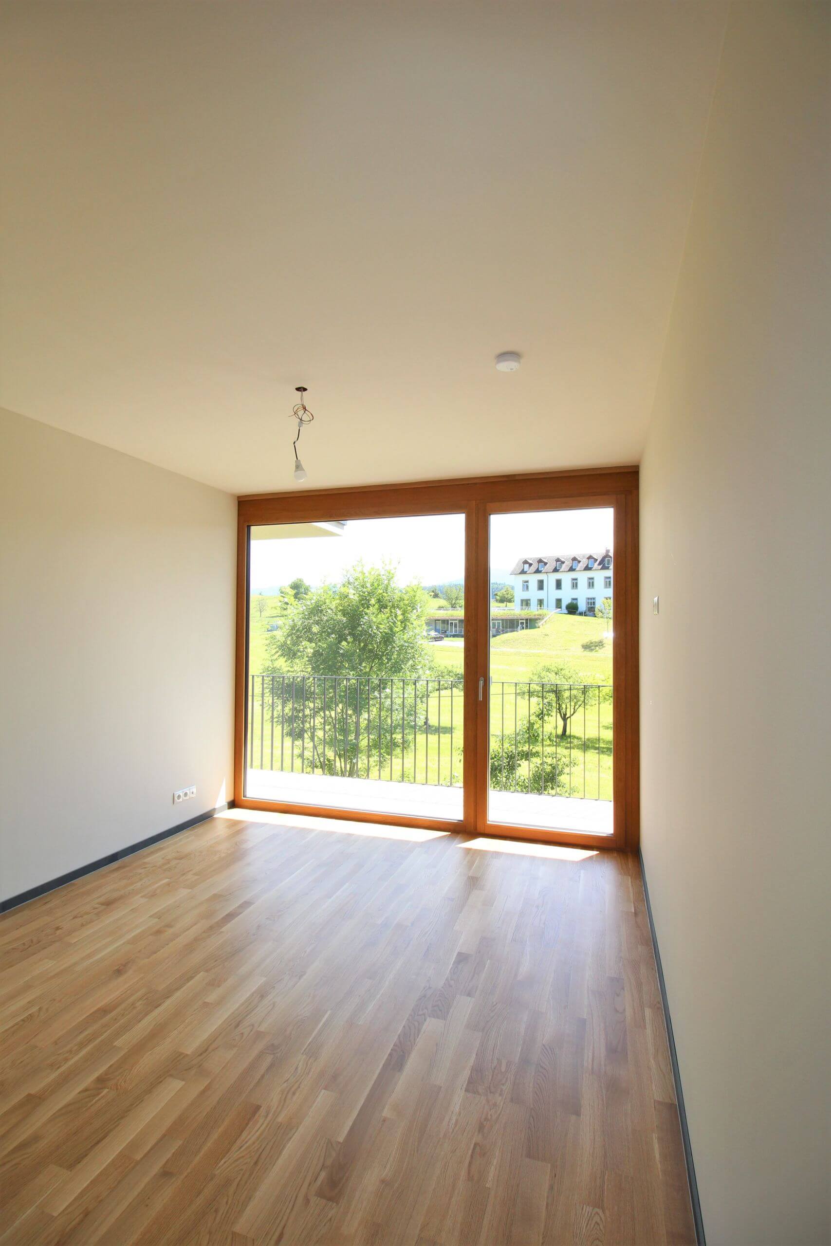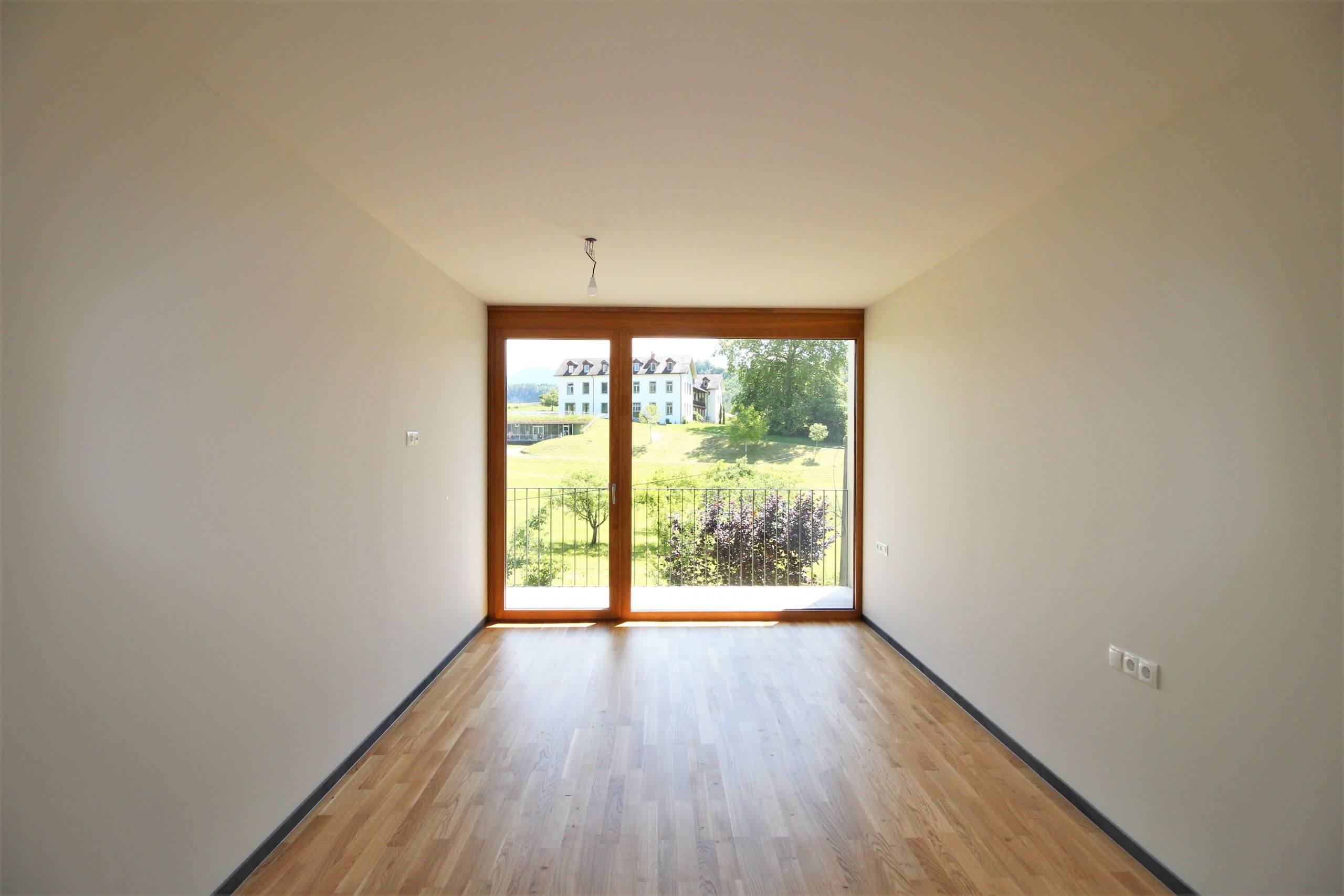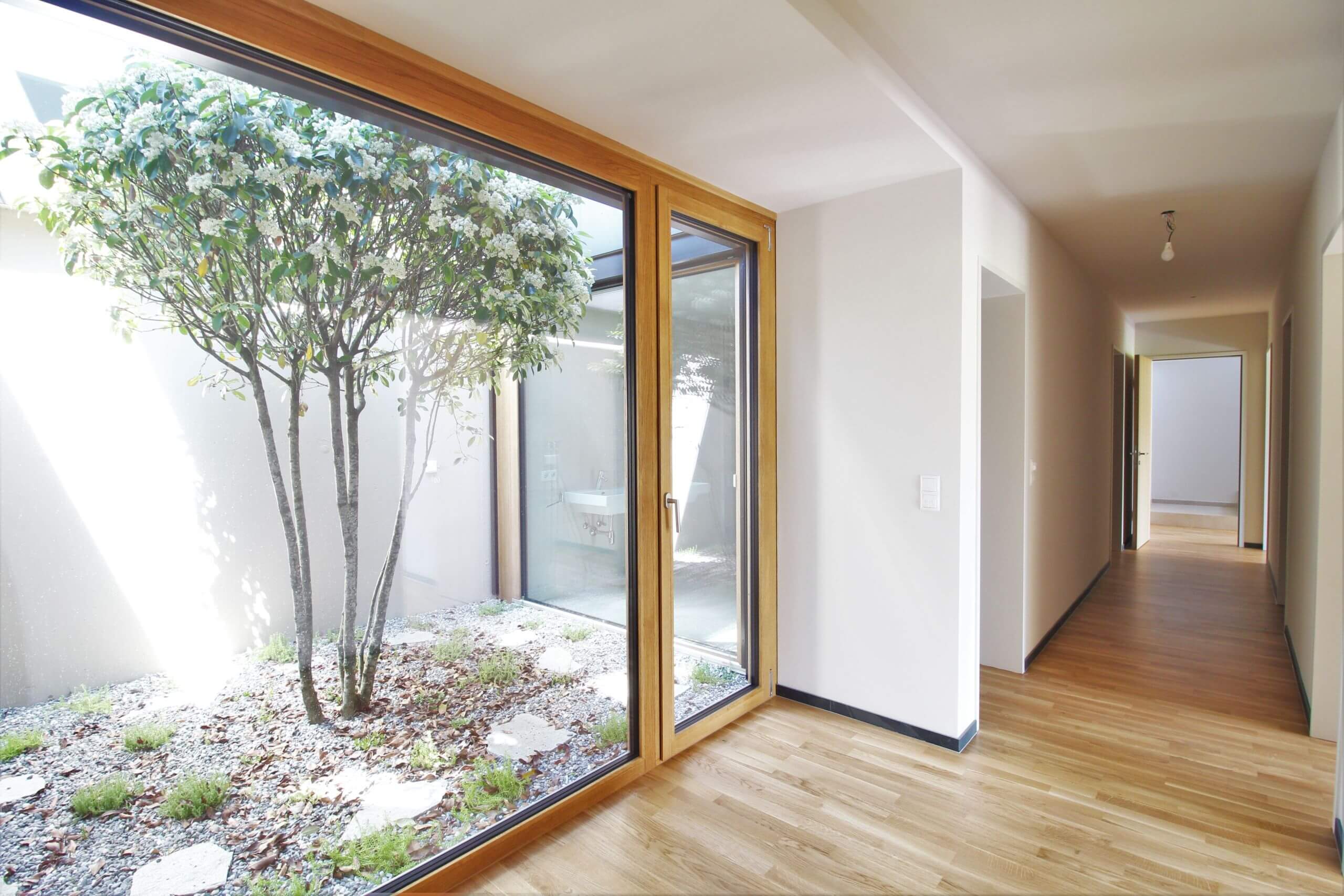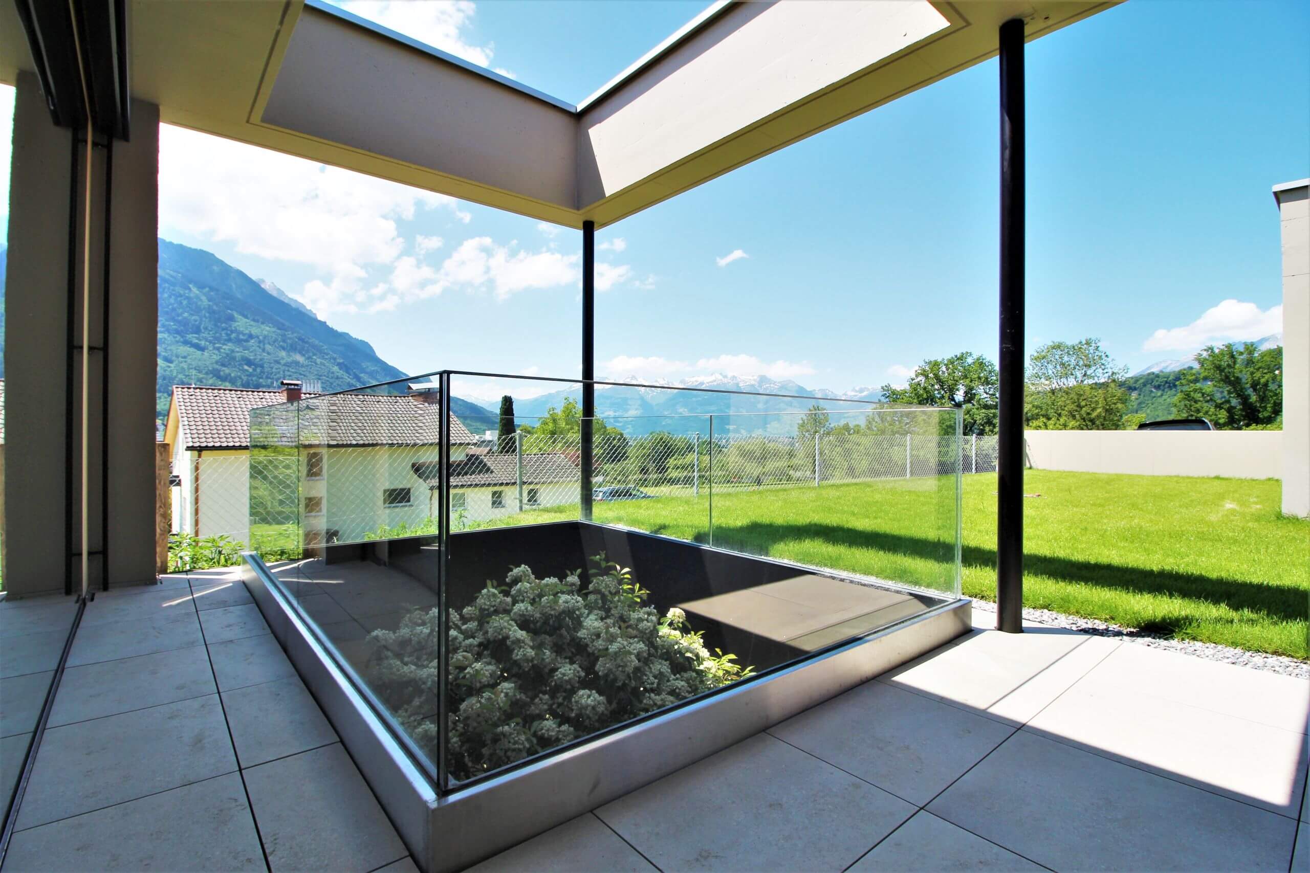 Die Genialität einer Hauskonstruktion liegt mitunter in ihrer Einfachheit. Die Villen Villa 08a ist das 2. Haus, es steht auf seinem eigenen, kleinen Reich und lehnt sich an. Das Haus öffnet sich zum abfallenden Hang und den umliegenden Obstwiesen mit 2 Balkonen. Der überdachte Gang führt zum Innenhof, der pflegeleicht in einen blühenden Garten verwandelt werden kann. Ranken und Kletterpflanzen können auf Wunsch der neuen Eigentümer Besitz von der Architektur nehmen und die Gartenmauern und den atriumartigen Innenhof verzieren.