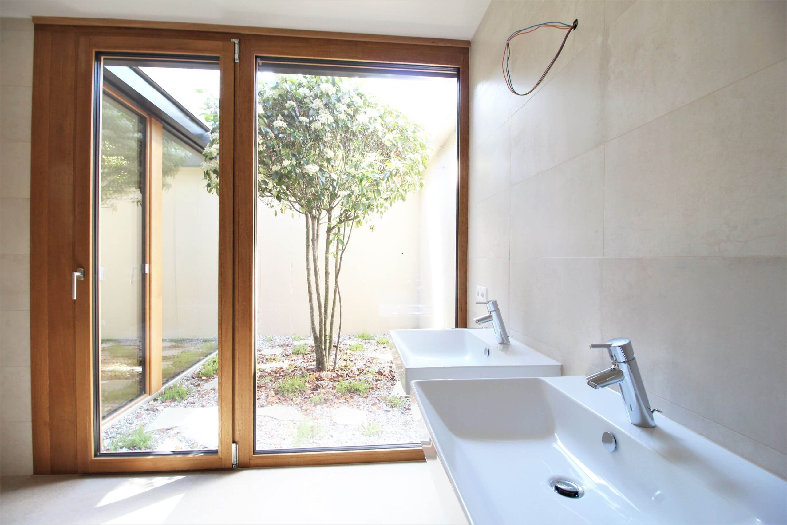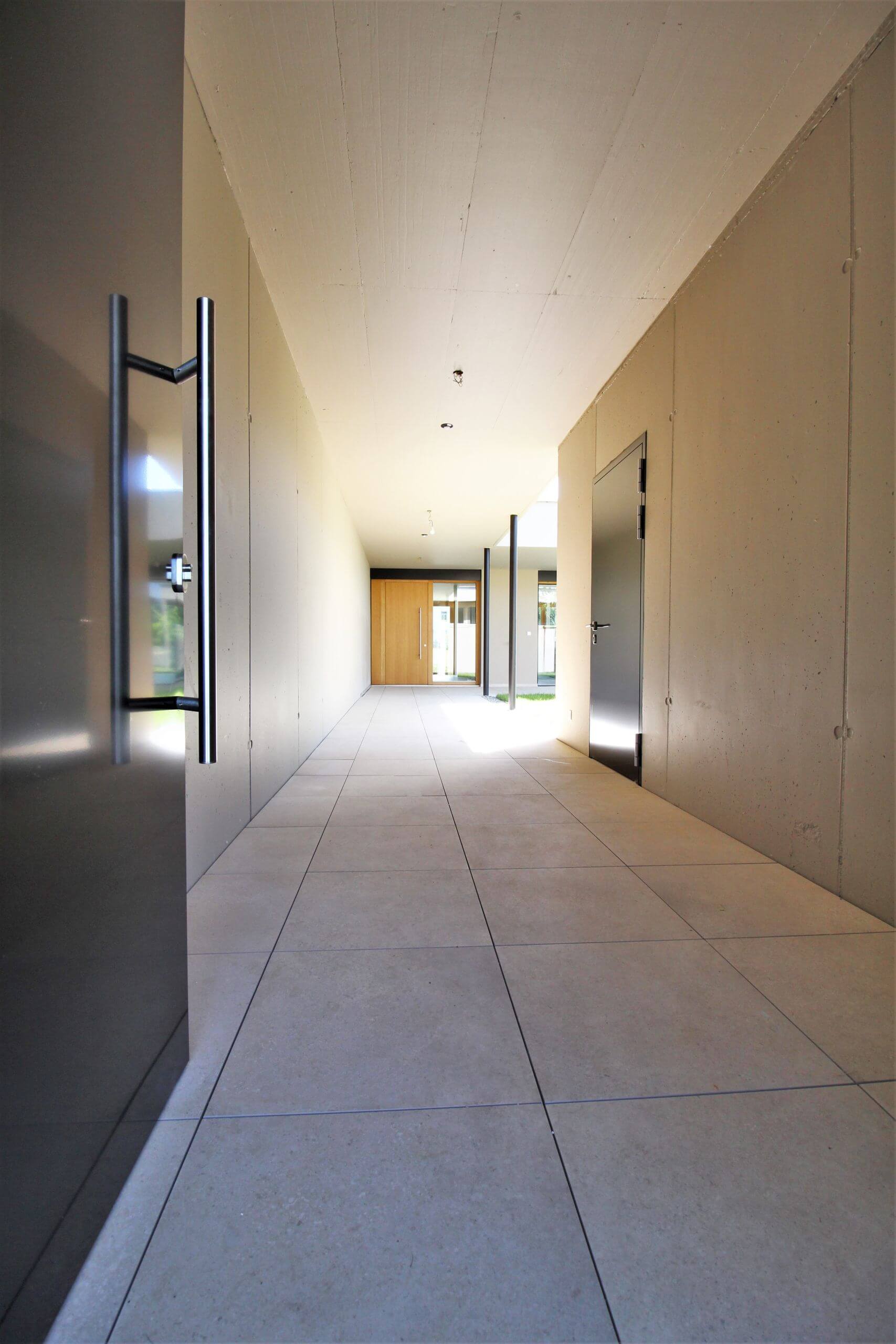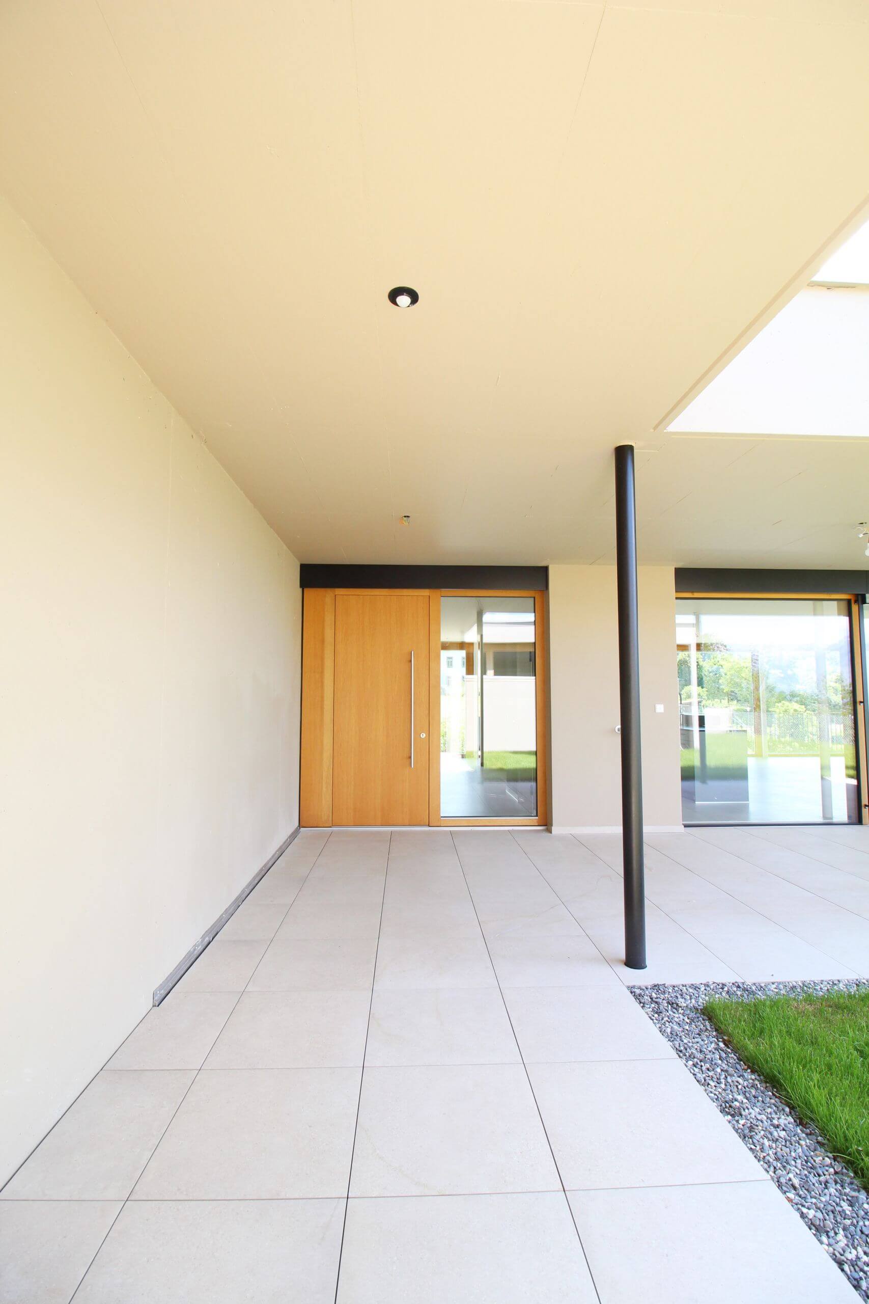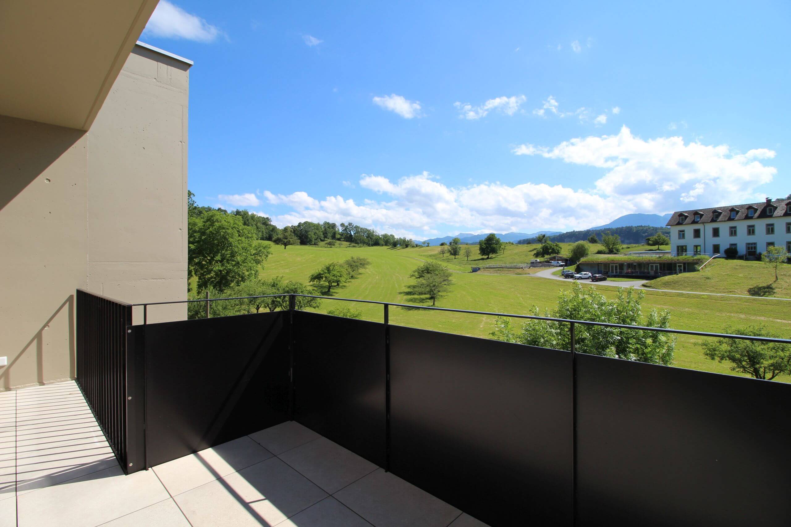 Die Genialität einer Hauskonstruktion liegt mitunter in ihrer Einfachheit. Die Villen Villa 08a ist das 2. Haus, es steht auf seinem eigenen, kleinen Reich und lehnt sich an. Das Haus öffnet sich zum abfallenden Hang und den umliegenden Obstwiesen mit 2 Balkonen. Der überdachte Gang führt zum Innenhof, der pflegeleicht in einen blühenden Garten verwandelt werden kann. Ranken und Kletterpflanzen können auf Wunsch der neuen Eigentümer Besitz von der Architektur nehmen und die Gartenmauern und den atriumartigen Innenhof verzieren.