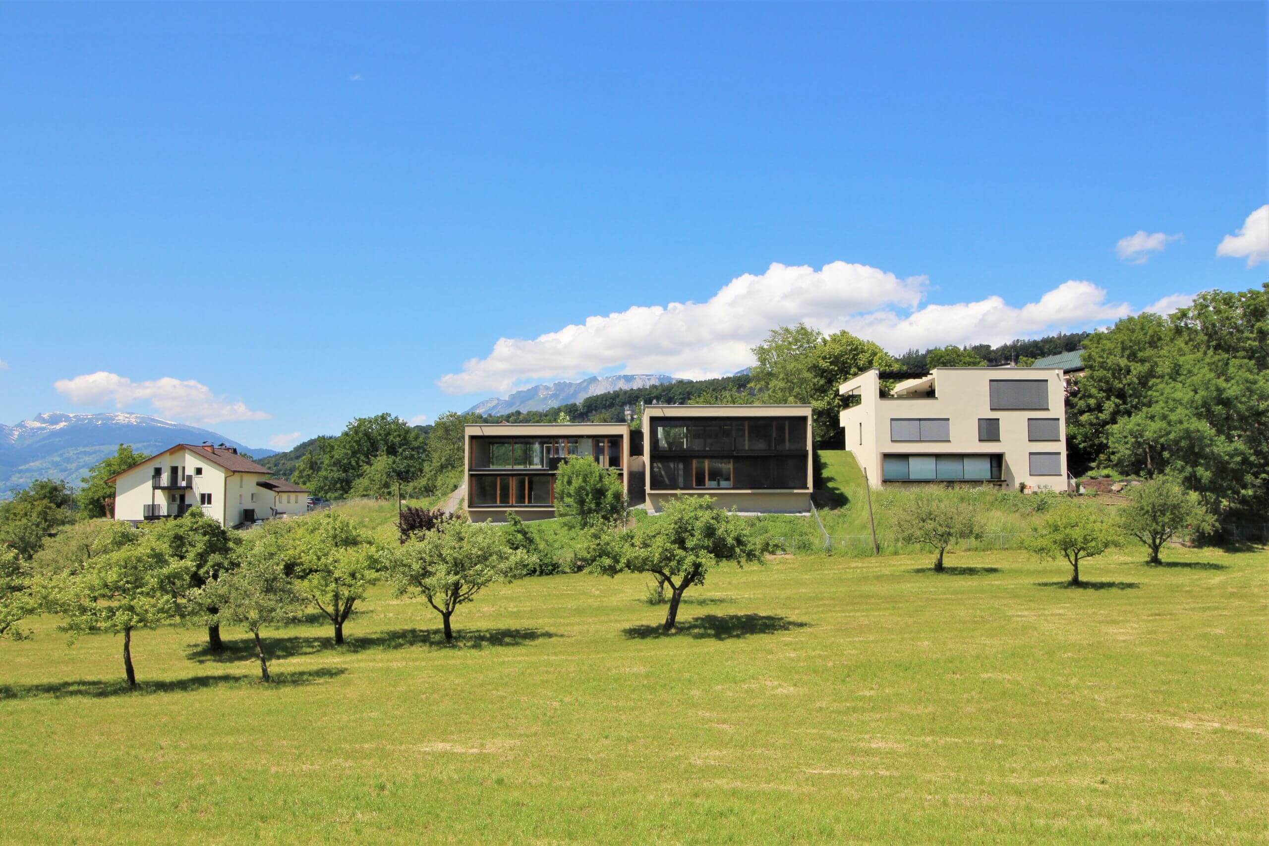 Am schmalen, leicht ansteigenden Rosamichlweg noch vor der Einfahrt der Wohngemeinschaft St. Michael der Caritas Vorarlberg, rechter Hand gelegen, entstehen 3 neue Einfamilienhäuser. Eingebettet im westlichen Hochpunkt des Blasenbergs, in Richtung Stadt sind die Grundstücke umsäumt von Wiesen und Weiden. Die Häuser sind autonom, entstehen in Nachbarschaft und nutzen, wo es Sinn macht, Synergien.